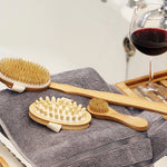 Exfoliating body and face brush set with a massager and detachable long handle.